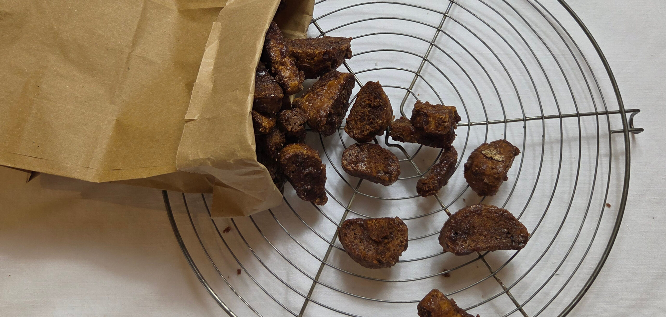 Glaçage : Faire chauffer la moitié des ingrédients du glaçage dans une grande poêle, ajouter la moitié des morceaux de pain d’épices, remuer jusqu’à ce que le glaçage adhère aux morceaux et soit bien absorbé. Laisser refroidir.