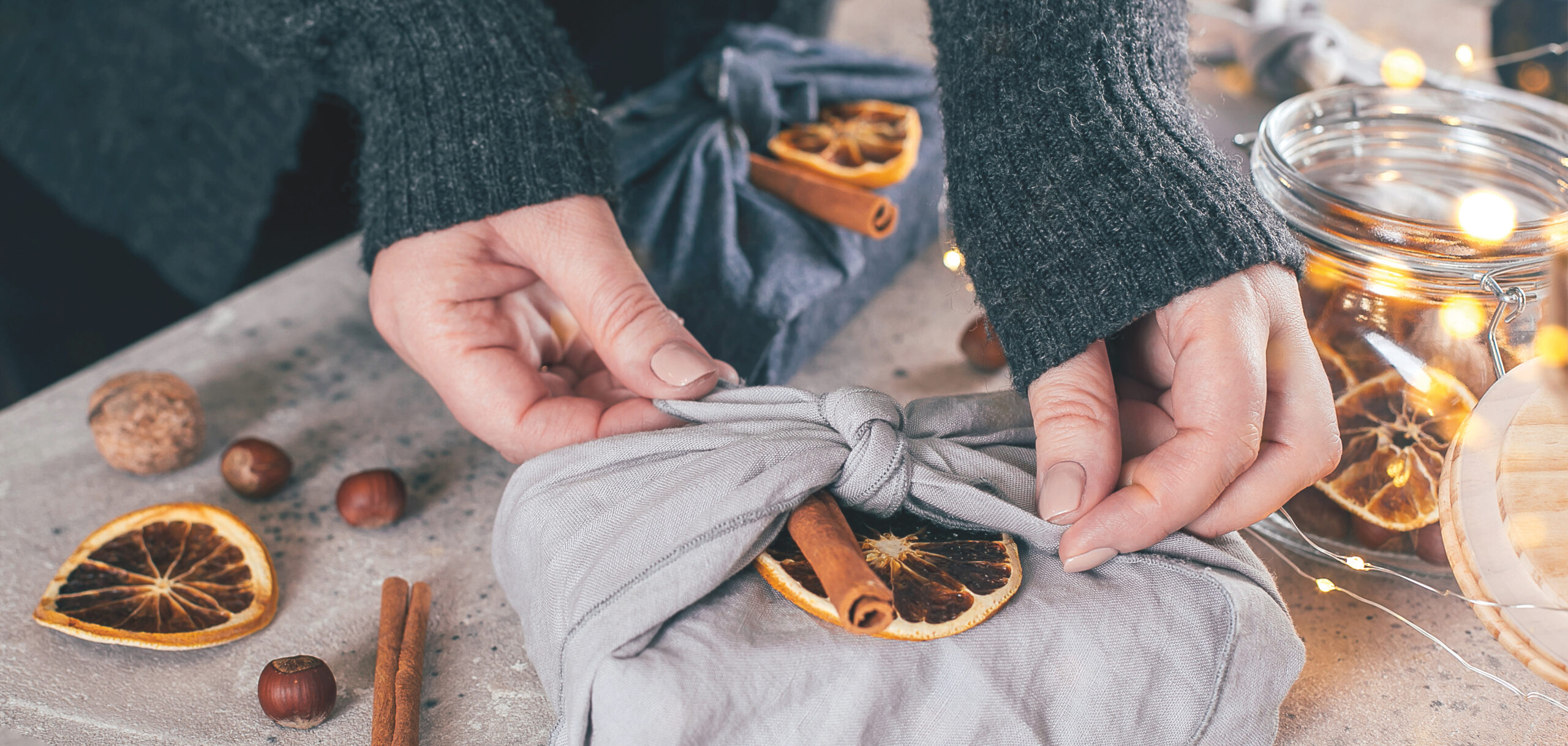 Des cadeaux emballés dans du tissu, décorés avec des matériaux naturels – simples, beaux et durables.