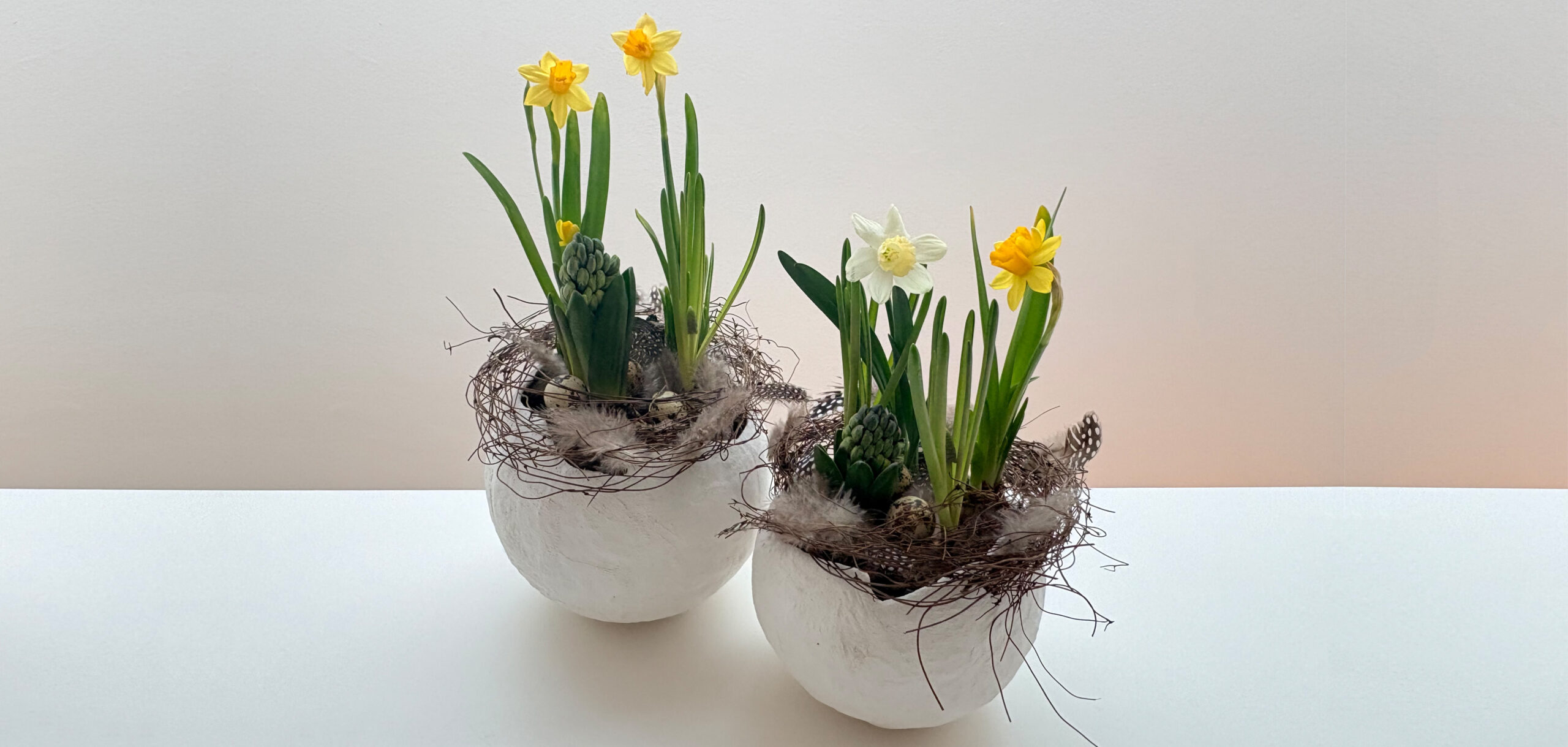 Le plâtre n’étant pas imperméable, commencez par placer un grand sac de congélation dans la coquille. Remplissez-le ensuite de terreau et plantez-y vos fleurs. Découpez le sac le long des bords de la coquille, puis décorez avec du paillis d’écorce, des brindilles, des œufs et des plumes pour une touche printanière.