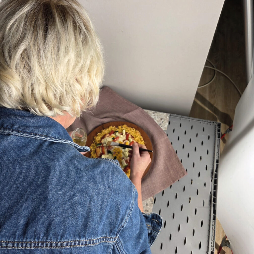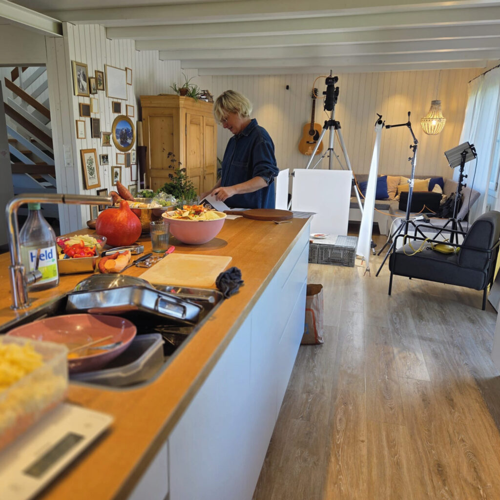Cela a vraiment démarré le lundi,. Les photographes Winfried et Lena ont installé le décor. Pendant ce temps, la styliste Vera a apporté des caisses d’accessoires et a commencé avec le stylisme culinaire. A partir de là, il a fallu cuisiner, styliser, photographier, retoucher les photos et les insérer dans la mise en page. L’ambiance sur le plateau était amicale, drôle et en aucun cas stressante. Une atmosphère de bien-être total.