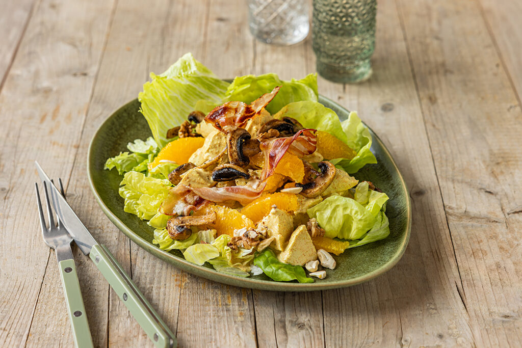 Judith Piller-Dietrich vous suggère sa recette de salade de poulet épicée. Laissez-vous surprendre par son bon goût d’orange, de champignon et de lard.