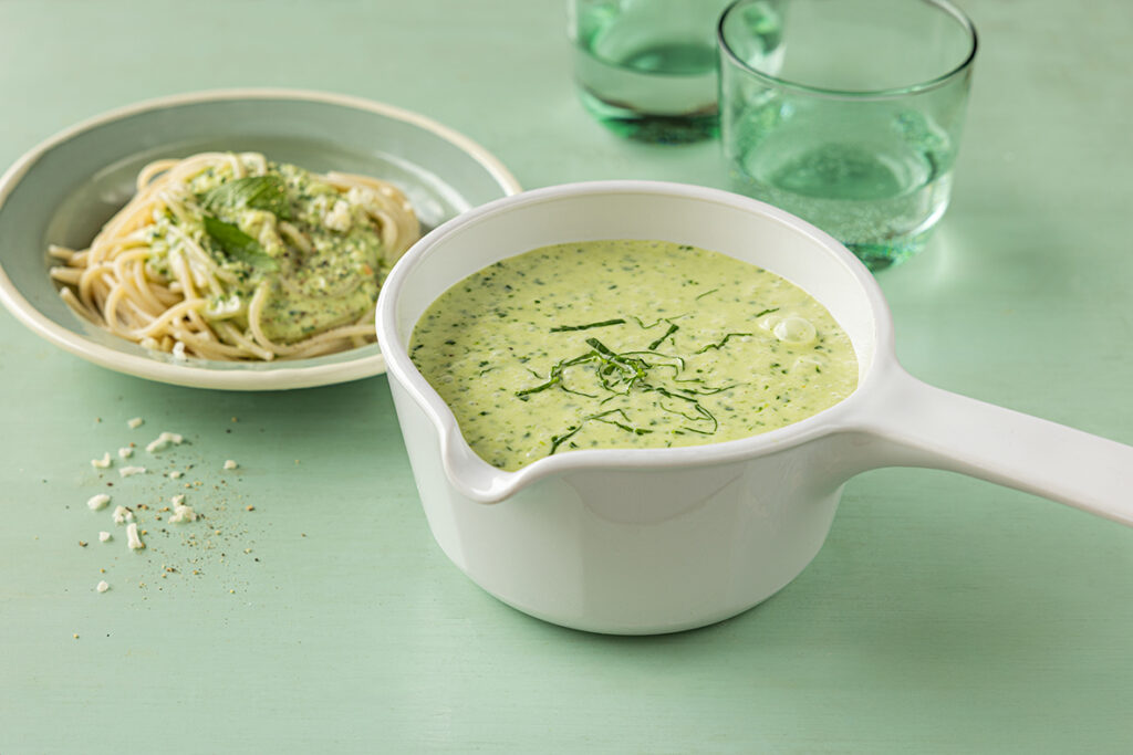 Bien mélanger la crème et la fécule, ajouter à la sauce, porter à ébullition, mixer. Laisser mijoter à feu moyen env. 10-15 min jusqu’à ce que la sauce soit crémeuse.